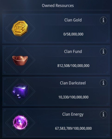 Имеются ресурсы клана в количестве: 812 508 капитал клана, 10 330 темной стали клана, 67 583 789 энергии клана.