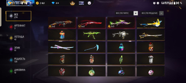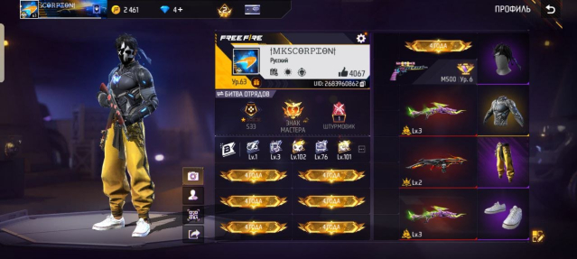 Краткое описание: хороший аккаунт фри фаер, много скинов, 3 эво, 10+ мастер