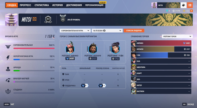 Закончила на д1 sup в 18-м сезоне. Мало играла в овервотч 2, так что за рейтингом не гналась