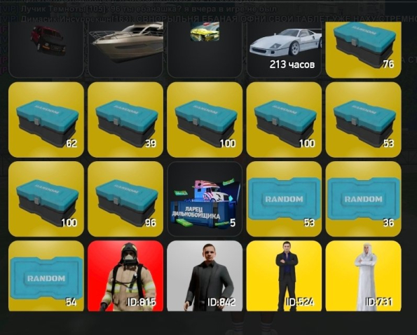 Подробное описание: Акаунт имеет всё, бизнес закусочная, машины ферма, квартира, машины 8 штук не щитая сертификатов с сертификатами 16 штук, цена начинается от 60 лямов, наличные 2 лорда, имущества на 10лярдов, скинов много, топовые скины цены которых от 100 лямов до 500 лямо, пожарный на сервере скин 3 только, также скин араба, ИКСЕТИОНА, две торговые лавки, 700 ларцов, машины Бугатти Верон, всякие топовые только автомобили на 3 лорда, также есть сертификаты на машины там одна 500 лямо, другие по 100, вообщем жирный акаунт продаю срочно.
