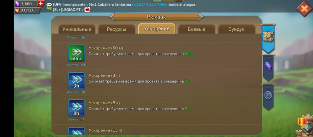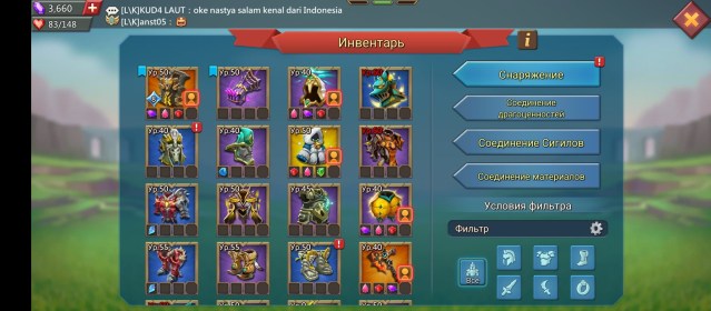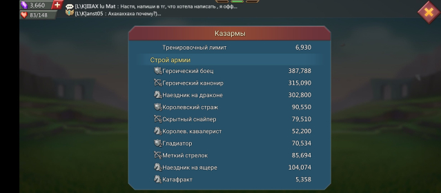 Подробное описание: Хорошие статы, есть войска, хорошие исследки, отличный шмот на 59 и 60уровень, фиол шмотка чемпа, сине-фиол камни в сете и инвентаре