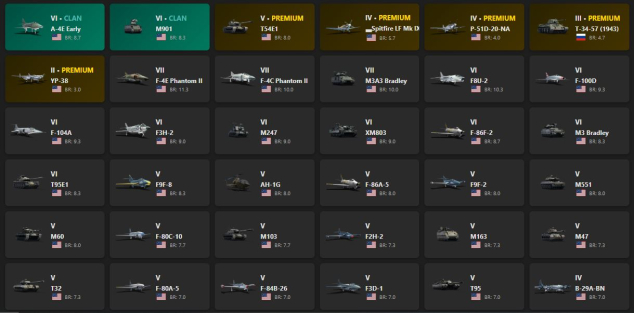 VII - 3, VI - 11, V - 17 A-4E Early, M901, T54E1, F-4E Phantom II, M3A3 Bradley, F8U-2, F-104A, M247
