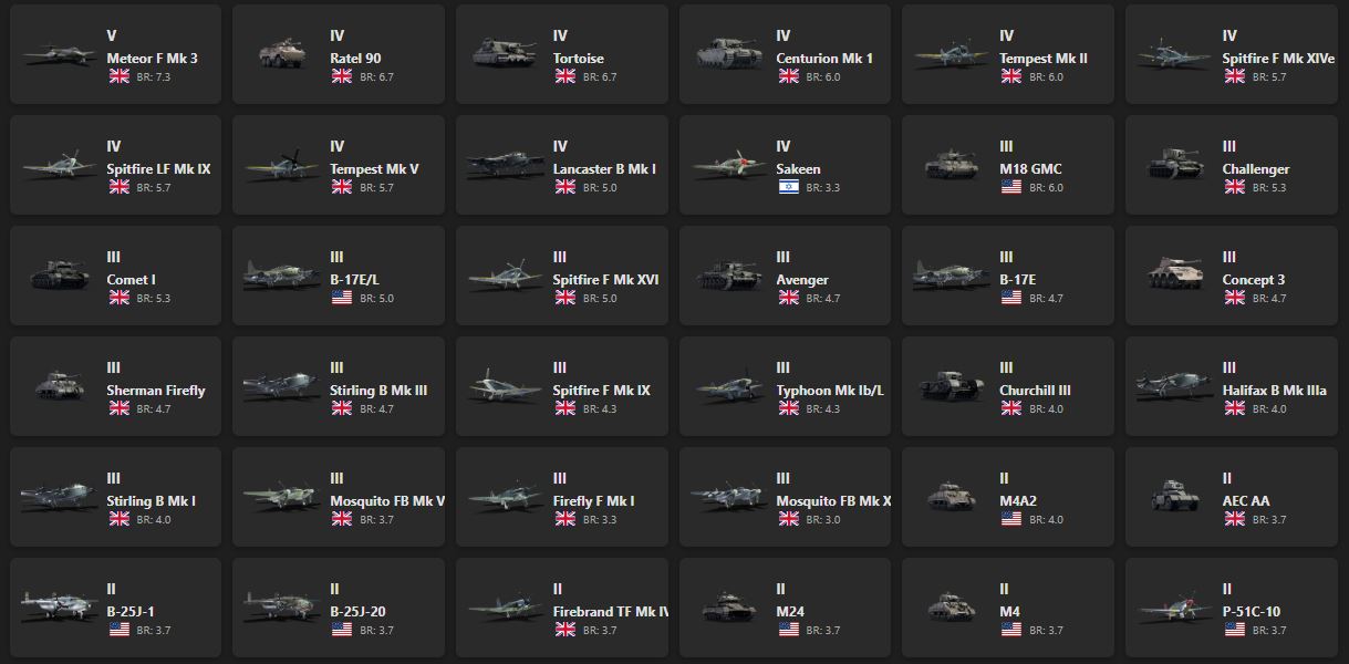 V - 1 Meteor F Mk 3, Ratel 90, Tortoise, Centurion Mk 1, Tempest Mk II, Spitfire F Mk XIVe, Spitfire LF Mk IX