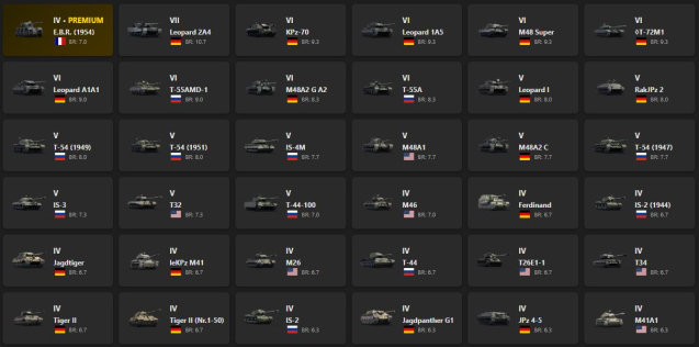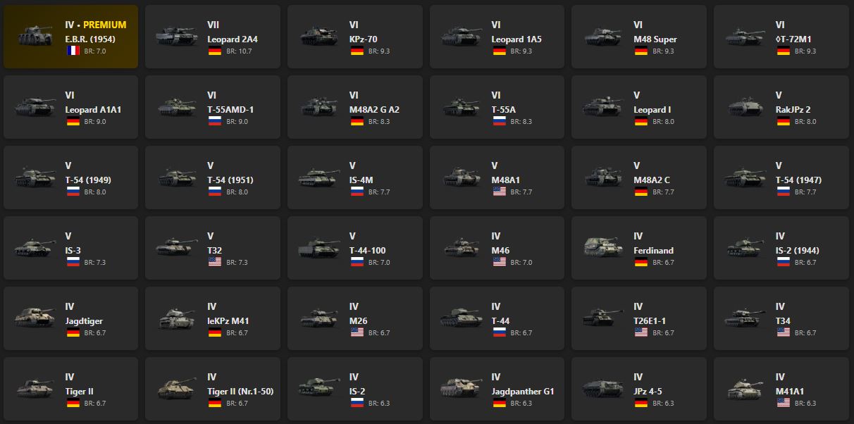 VII - 1, VI - 8, V - 11 E.B.R. (1954), Leopard 2A4, KPz-70, Leopard 1A5, M48 Super, T-72M1, T-55AMD-1