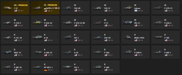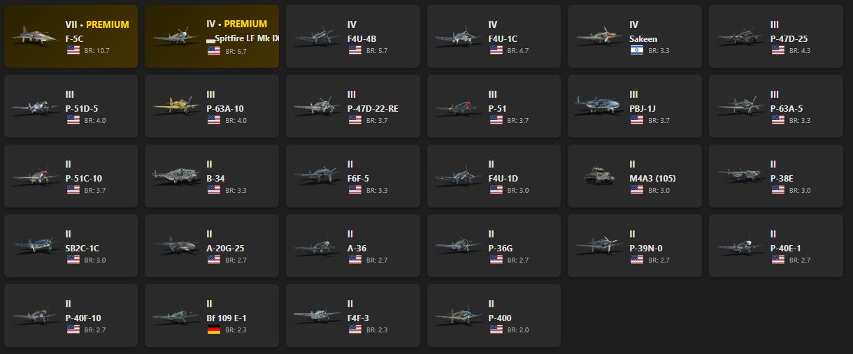 VII - 1 F-5C, Spitfire LF Mk IXc, F4U-4B, F4U-1C, Sakeen, P-47D-25, P-51D-5, P-63A-10