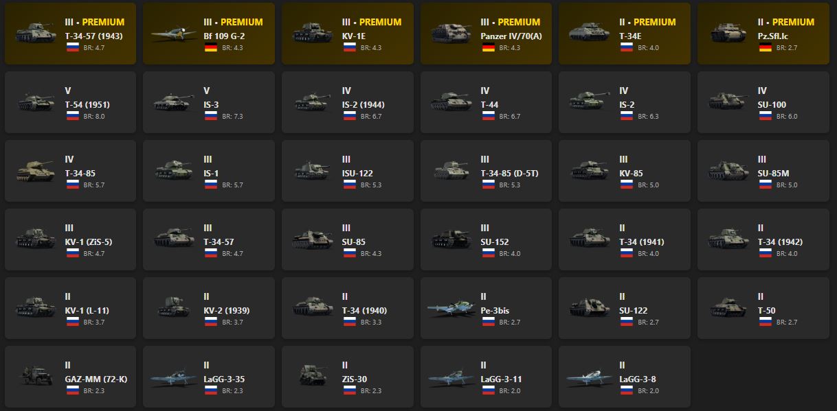 V - 2 T-34-57 (1943), Bf 109 G-2, KV-1E, Panzer IV/70(A), T-34E, Pz.Sfl.Ic, T-54 (1951), IS-3