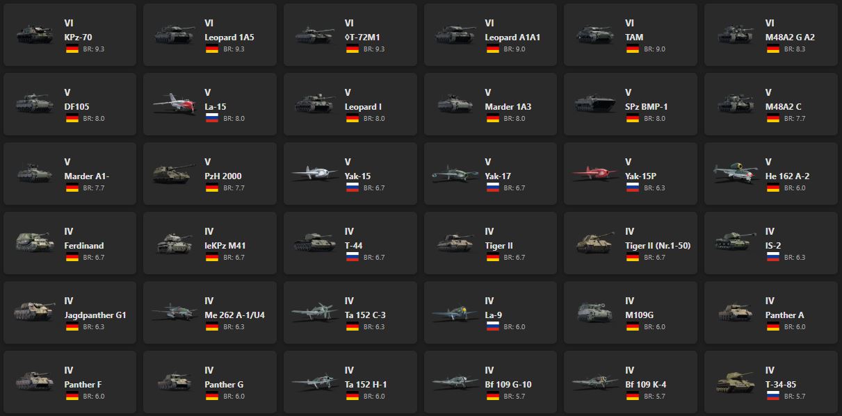 VI - 6, V - 12 KPz-70, Leopard 1A5, T-72M1, Leopard A1A1, TAM, M48A2 G A2, DF105, La-15, Marder 1A3