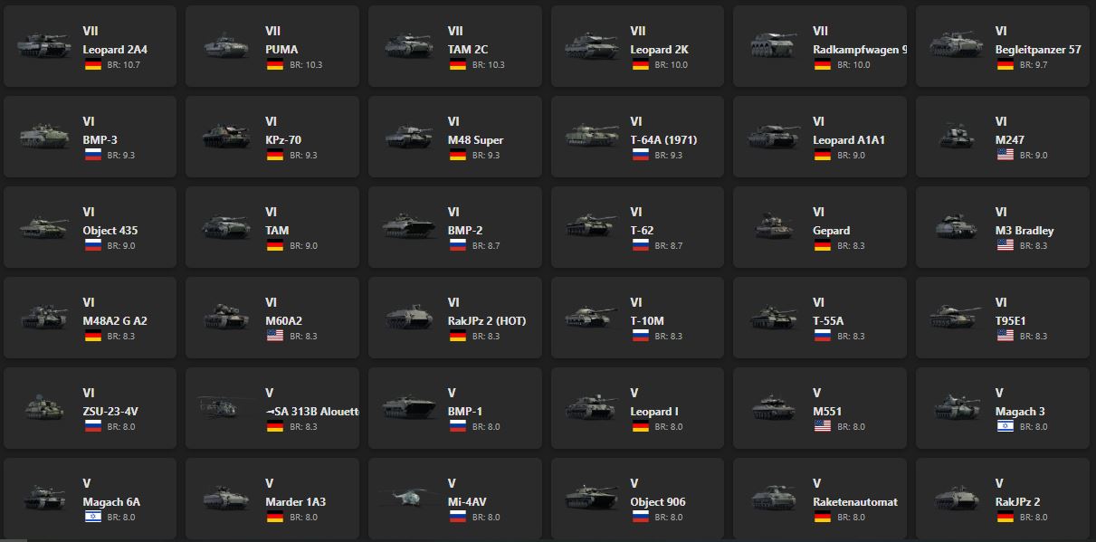 VIII - 3, VII - 13 Leopard 2PL, Leopard 2A5, Leopard 2A6, T-10A, T-72AV (TURMS-T), Ka-50, Su-25K