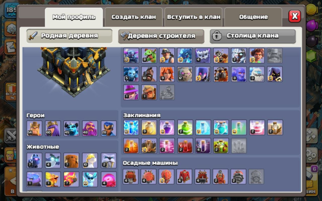 Уровень Ратуши: 17Краткое описание: 17 тх с прокачкой фулл 16 тх, 54/60/45/48/28, много донат скинов и оформлений, описание 👇