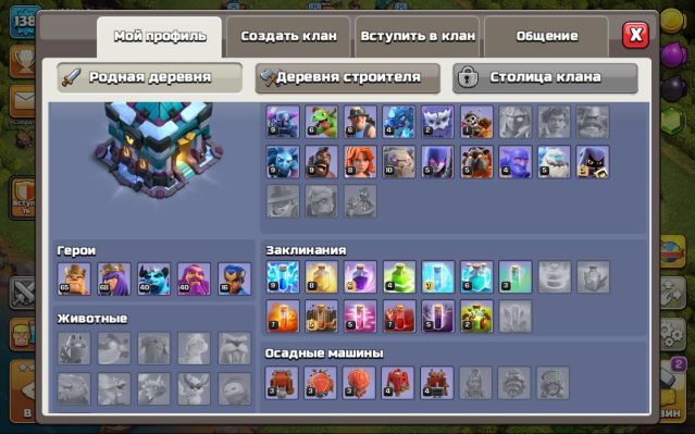 Уровень Ратуши: 13Краткое описание: 13 тх 85% от фулла, 65/68/40/40/16, вкачано снаряжение, описание 👇
