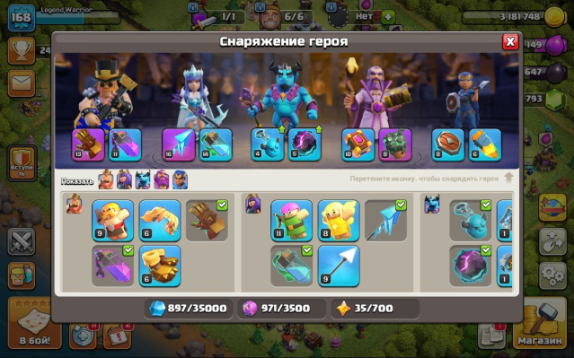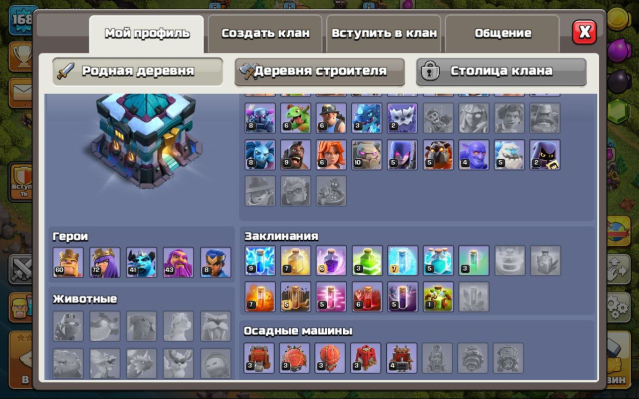 Уровень Ратуши: 13Краткое описание: 13 тх с прокачкой фулл 12, 60/72/41/8, вкачано снаряжение, 310 лвк, описание 👇