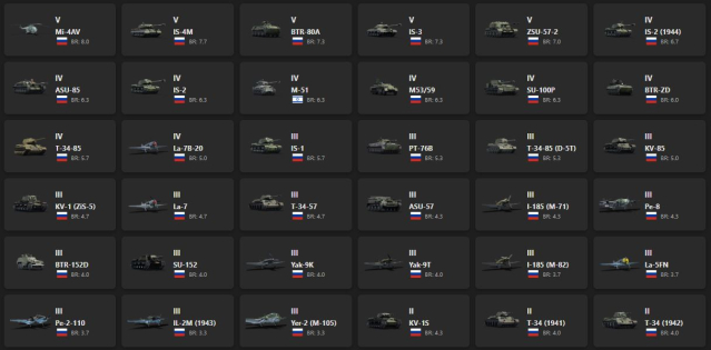 V - 5 Mi-4AV, IS-4M, BTR-80A, IS-3, ZSU-57-2, IS-2 (1944), ASU-85, IS-2, M-51, M53/59