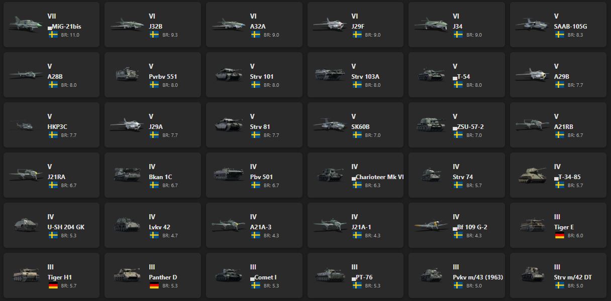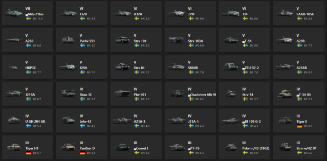 VII - 1, VI - 4 MiG-21bis, J32B, A32A, J29F, J34, SAAB-105G, A28B, Pvrbv 551, Strv 101, Strv 103A