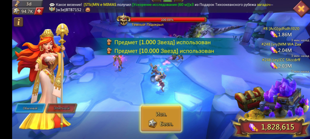 Платформа: AndroidКраткое описание: 290кк мощи(20кк войск в больках), т4, неплохой шмот на охоту и войну, 3 боевых слота