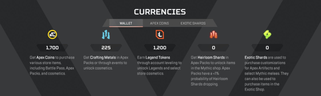 — 225 crafting metals + 1200 legend tokens + 1700 apex coins + 0 exotic shards