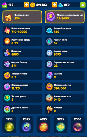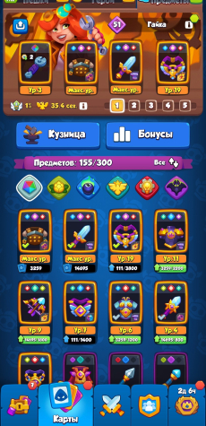 Краткое описание: Аккаунт rush royale мой, 4251 крит, 9 лег 15лвлПодробное описание: Аккаунт rush royale мой, 4251 крит, 9 лег 15лвл, много карт на леги есть, не апал без надобности, 9 легендарных предметов, 145 других предметов-можно апать можно разобрать, ключ на гайку 3лвл, осколки 710 и многое другое. Продаю, устал от игры.
