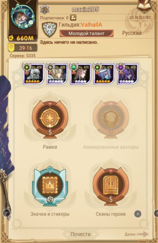 Краткое описание: 📜 39 ГЛАВА ⏫ 247 LVL 🏰 593 Этаж башни 🤍 41 Возвышенных героев ⚔️ 660M Мощи 📩 С почтой