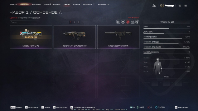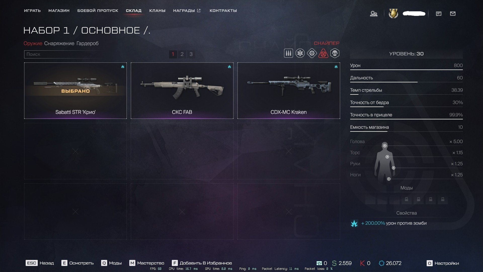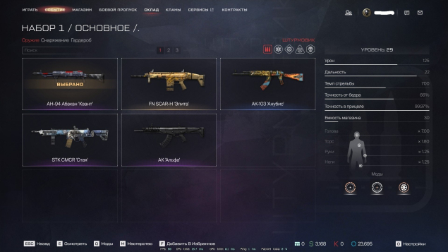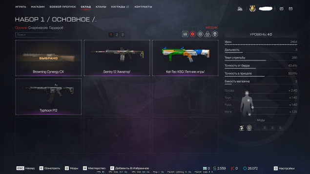 Подробное описание: STK Стая(25ур), AH-94 Абакан Квант(29ур), FN SCAR-H Элита, Browning CX(40ур), Kel-Tec KSG Летние игры, CTAR-21 Стражник(26ур), Magpul PDR-C Ас(33ур), Sabatti Крио(30ур), CKC FAB, Sig Saeur Крысолов(40ур), 32561 корон, 26072 деталей