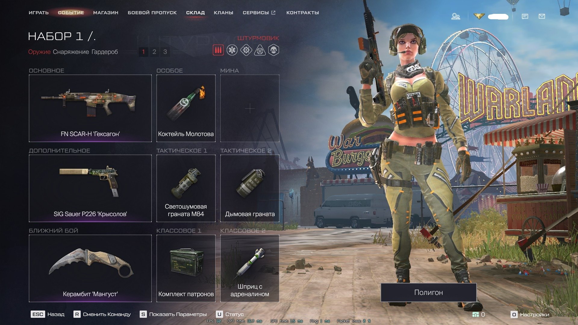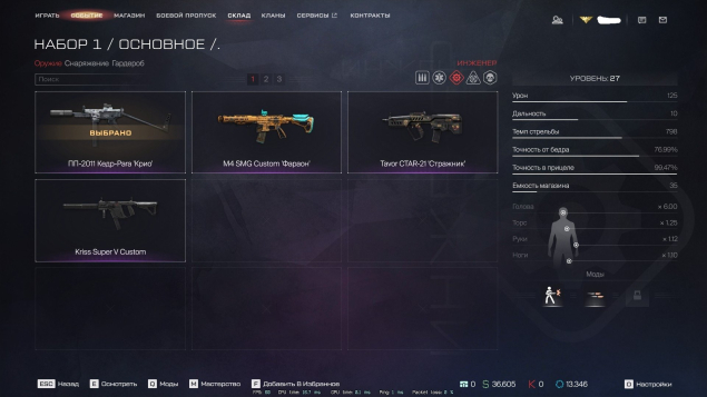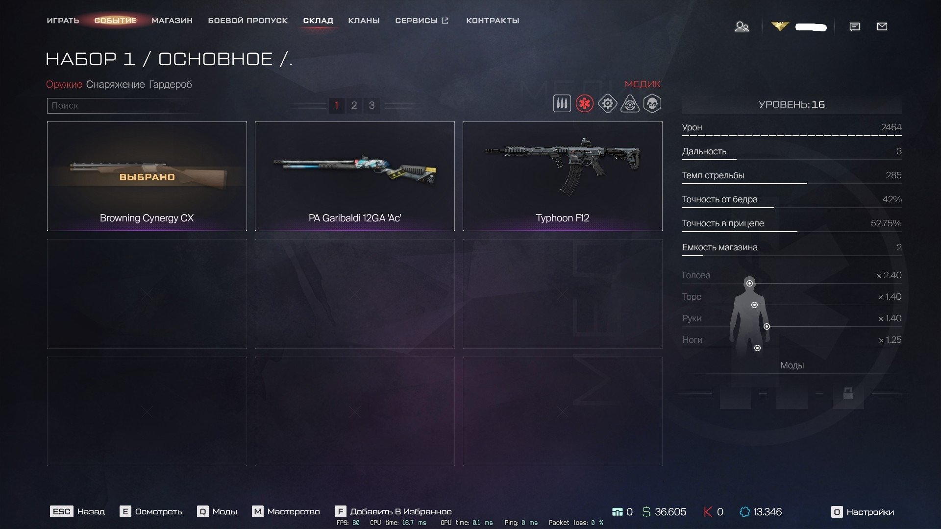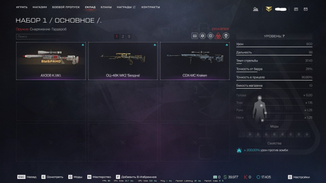 FN SCAR-H Гексагон(13ур), Browning Cynergy CX(16ур), Garibaldi 12GA Ас, Кедр Крио(27ур), Tavor CTAR-21 Стражник(19ур), AX308 K.I.W.I, ОЦ-48K MK2 Бездна, Sig Sauer(26ур), Керамбит мангуст, 17405 деталей