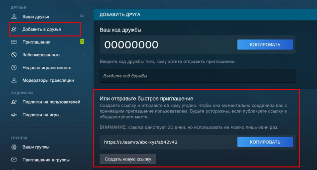 1️⃣ После оплаты в чат присылаете быструю ссылку на добавление в друзья. Ссылку можно найти в настройках своего профиля Стим, в разделе Друзья -> Добавить в друзья. Ссылка формата: s.team/p/abc-xyz/ab42v42
