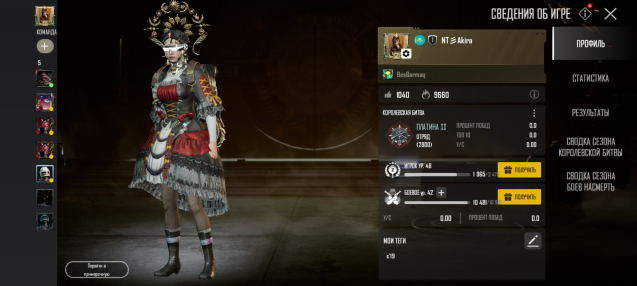 Подробное описание: Аккаунт создан с 16 сезона в аккаунте есть: Улучшаемые костюма: Лич мороз (Пылающий череп 4 Ур), Алый феникс 3 Ур, 61 мифических вещей, было 2 ранга победителя (21-22 сезона), есть 2 эффекта именной таблички, есть 83 куриных медалей, есть 349 NC (это игровая валюта)