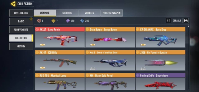 🔫 Skins Gun: 1 Mythic — 7 Legendary — 159 Epic — 306 Rare🔫