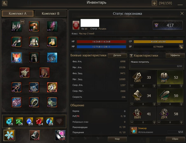 РБ ствол +5, Шлем Маны +5, Перчатки Безмолвия +5, Символ Фатальности +5, МЖ сет +5.