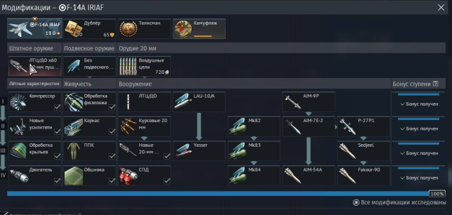 На аккаунте так же присутвует самолет, с уникальные ракетами воздух-воздух (fakour 90), на данном самолете так же установлен талисман и полная прокачка модулей
