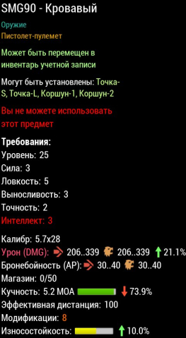 Сервер: RU-3Краткое описание: SMG 90 Кровавый М8 +21.1% к урону, 5.2МОА, Износ +10