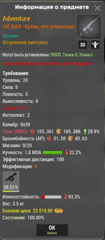 Сервер: RU-1Краткое описание: АС ВАЛ — кровь пот м6 28.9% урон -22.2 кучность -93.3 износ (все сервера)