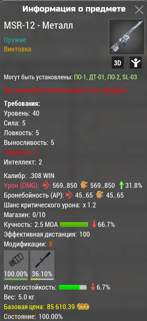 Сервер: RU-5Краткое описание: Msr-12 металл м8 (569-850) 31.8% урон -66.7 кучность -6.7 износ (все сервера)