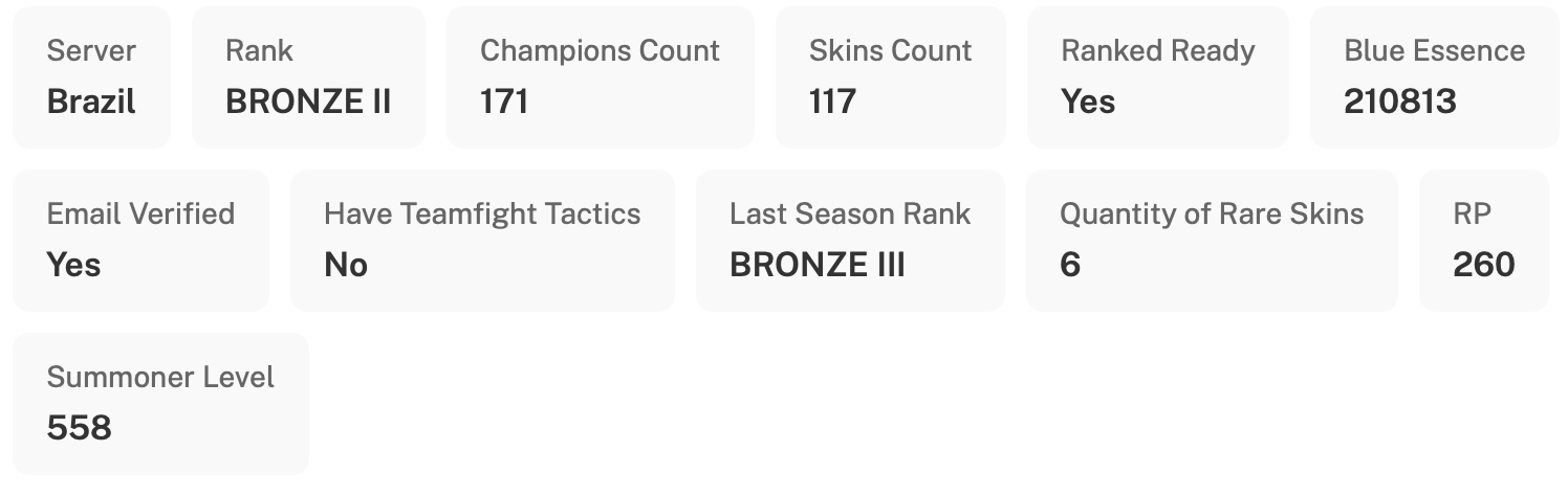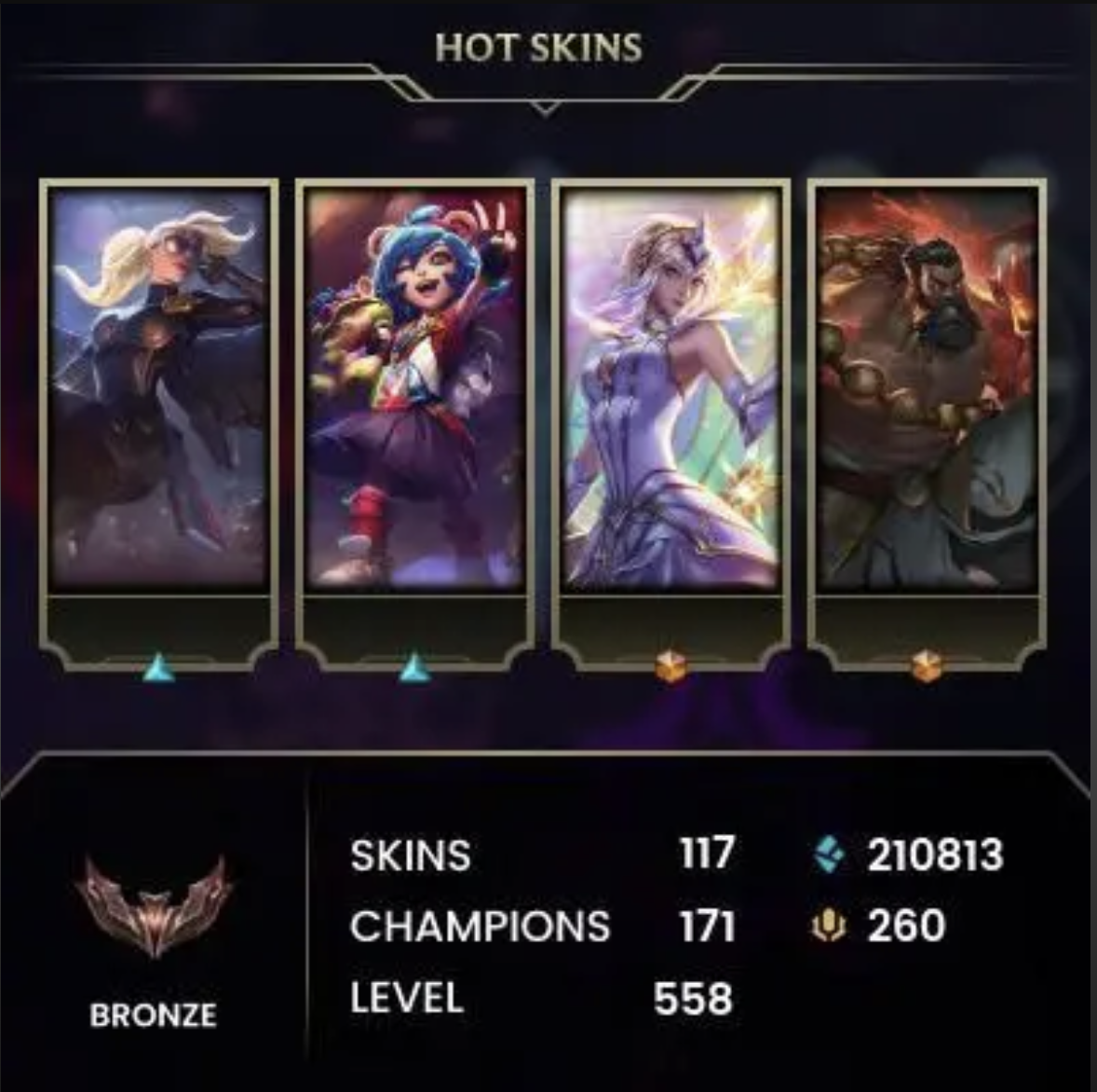 💎 Поднимите свой игровой опыт на новый уровень с аккаунтом League of Legends 558-го уровня и рангом БРОНЗА II. Этот аккаунт включает в себя 171 чемпиона, 210 813 единиц Синей эссенции, 260 Riot Points и 15 редких скинов. Вы получите полный доступ к аккаунту Riot Games и привязанной к нему электронной почте, а также возможность привязать свой адрес электронной почты и номер телефона. Настройте параметры аккаунта в соответствии со своим уникальным стилем.