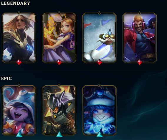 Прочие Скины: Изумрудная Кейл, Одичавший Варвик, Браум Львиное Сердце, Ионийский Мастер Йи, Совершенная Кейл, Сивир, королева воинов, Сердцеедка Вейн, Riot Кейл, Мародер Эш, Fnatic Корки, Леона из Железных Солари, Тусовая Леона, Адский кулинар Моргана, Энни Красная Шапочка, Защитница Леона, Дух луны Моргана