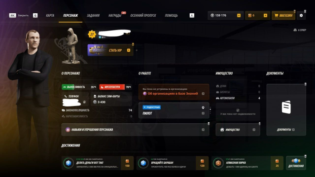Имущество: 4 машины Saab 9.3 turbo, Volkswagen Scirocco 1-2 стейдж, Honda Accord Type s, Toyota LC 100, в наградах ещё две машины Таврия и еще одна, примерно все на 6кк, а также баланс 159к.