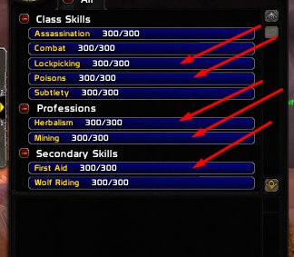 3. Профессии 300/300 Горное дело/Травничество/Первая помощь/Взлом замков