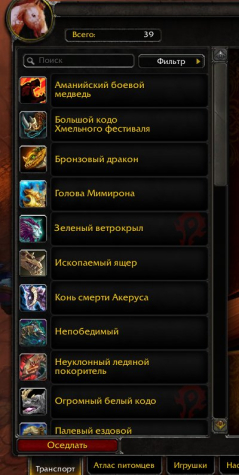 Маунты: Хмельные лич, Голова мимирона, Непобедимый, Зулиан тигр, Неуклонный ледяной покоритель.