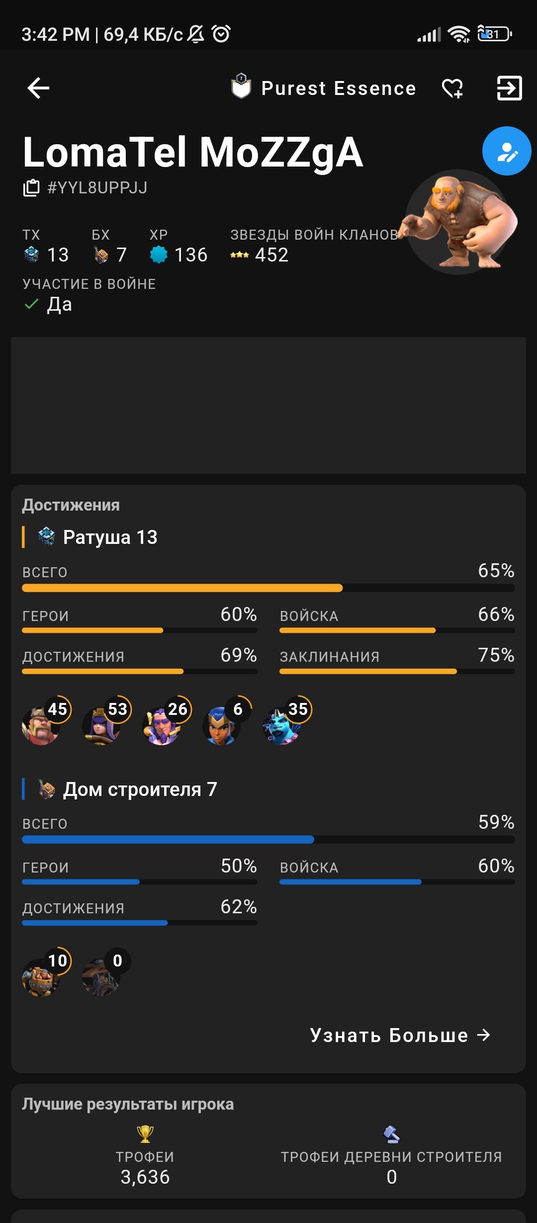 Уровень Ратуши: 13Краткое описание: 🔵 𝟔𝟓% 𝗧𝗫 𝟏𝟑🔵 ⭐ГЕРОИ 𝟒𝟓/𝟓𝟑/𝟑𝟓/𝟐𝟔/𝟔⭐ 💎𝟒𝟕𝟓 КРИСТАЛЛОВ 💎 👑𝟏𝟑𝟔 ЛВЛ 👑 ✅ Быстрая ВЫДАЧА ✅