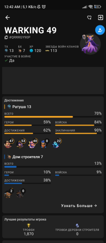 Уровень Ратуши: 13Краткое описание: 🔵 70% ТХ 13 🔵 ГЕРОИ 47/53/22/40 🔵 4 СКИНА ГЕРОЕВ 💎 1678 КРИСТАЛЛОВ 💎 👑120 ЛВЛ 👑 ✅ Быстрая ВЫДАЧА ✅