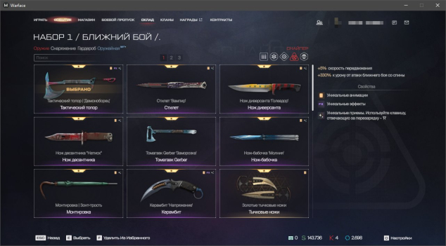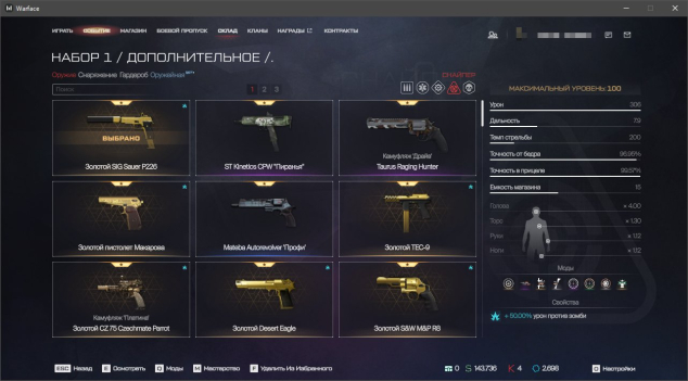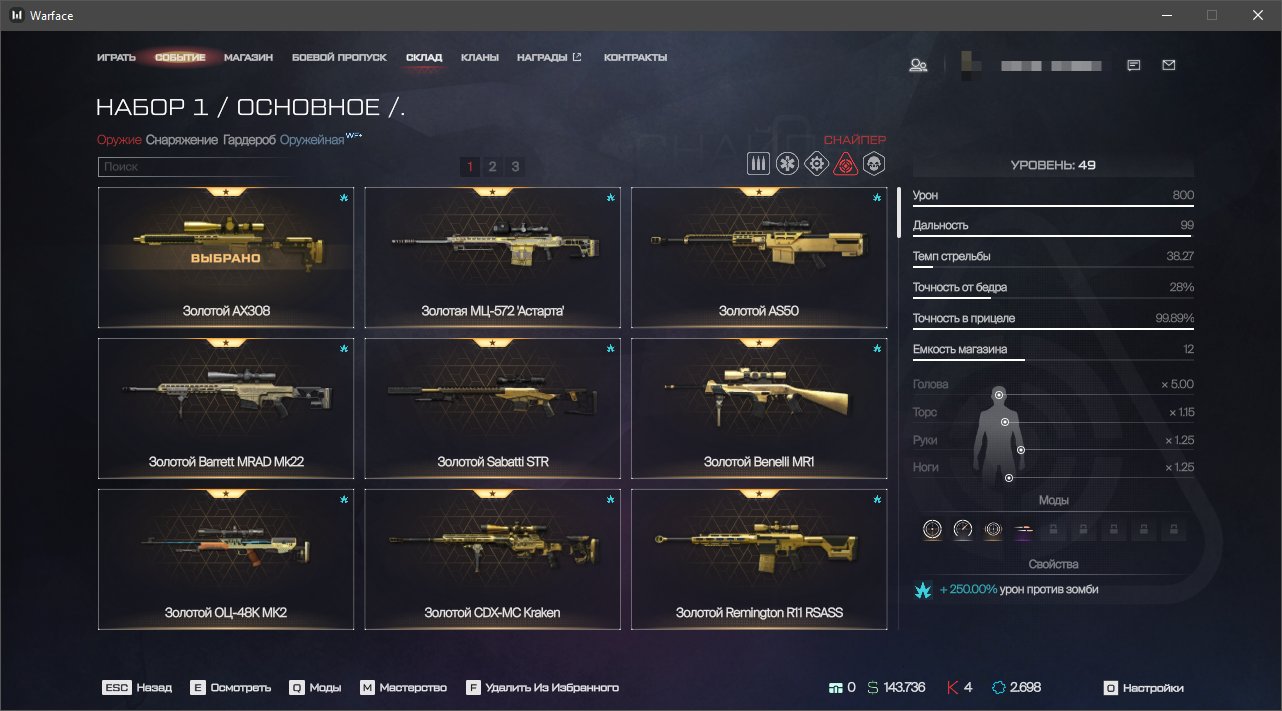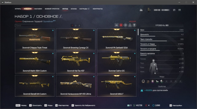 ✔️ 50 золотых оружий. Практически всё на золотых модах по 3-5, есть уникальные достижения, задоначено более 400 000 рублей, почти все ножи с анимацией, много внешностей которые уже никак не достать, много эксклюзивных оружий и брелков, есть супер-мега-эксклюзив-платиновый пистолет (на который люди тратили по 50 000р. и не выбивали, а ещё… на медика стоит 2 дыма (сейчас это никак нельзя сделать), просто лучший аккаунт на рынке, с полностью