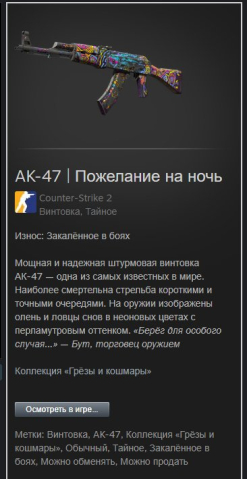 Краткое описание: AK-47 | Пожелание на ночь Износ: Закалённое в боях