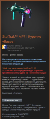 Подробное описание: StatTrak MP7 Курение убивает с флоатом 0,000740991