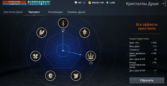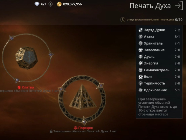 Заряд Души 7-2, Атака 8-1, Хранитель 7-1, Завоевание 7-0, Дуэль 7-0, Энергия 7-0, Самоконтроль 7-0, Воля 7-0, Терпимость 7-0, Вдохновение 5-1.