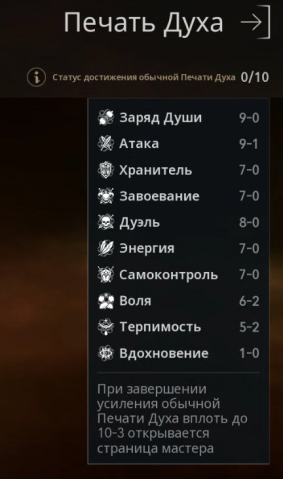 Заряд Души 9-0, Атака 9-1, Хранитель 7-0, Завоевание 7-0, Дуэль 8-0, Энергия 7-0, Самоконтроль 7-0, Воля 6-2, Терпимость 5-2, Вдохновение 1-0.