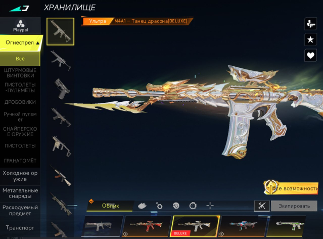 На аккаунте 4 ультра скина на оружие, 1 ультра скин на персонажа, 15 легендарных скинов на оружие. Также есть редкая катана (первый скин на холодное оружие), M4A1 DELUXE Танец дракона (выпущена в год дракона).