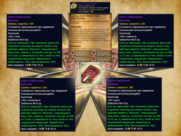 Подробное описание: Хочешь выжать максимум из своего персонажа? «Колода Аристократов» открывает квест «Колода карт Новолуния: Аристократы», за который ты получаешь легендарную Карту Новолуния: Величие — предмет, который по праву считают лучшим тринкетом для любого класса.