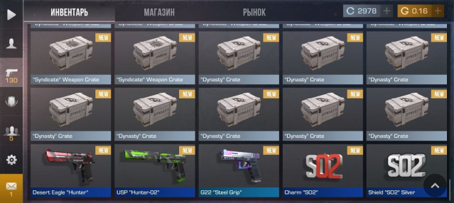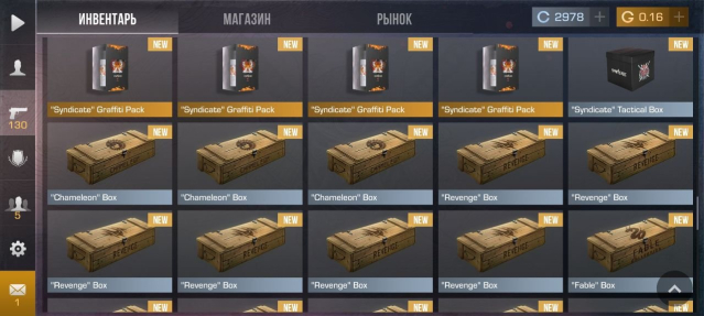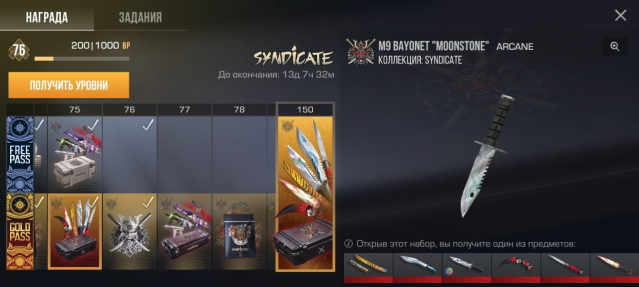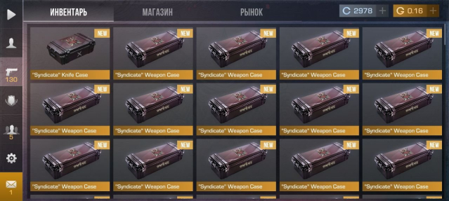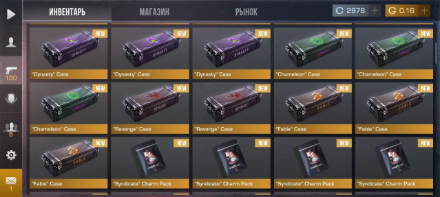 Кейсы: «Syndicate» Knife Case (1), Syndicate Tactical box (1) «Syndicate» Weapon Case (14), Dynasty (3), Chameleon (3), Fable (3) Revenge (2) и другие.