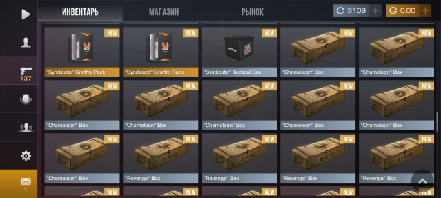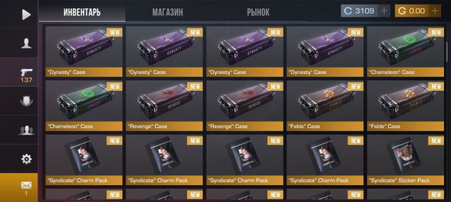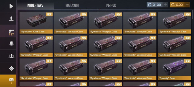 Кейсы: «Syndicate» Knife Case (1), Syndicate Tactical box (1) «Syndicate» Weapon Case (14), Dynasty (4), Chameleon (2), «Revenge» Case (2), Fable (2) и другие.