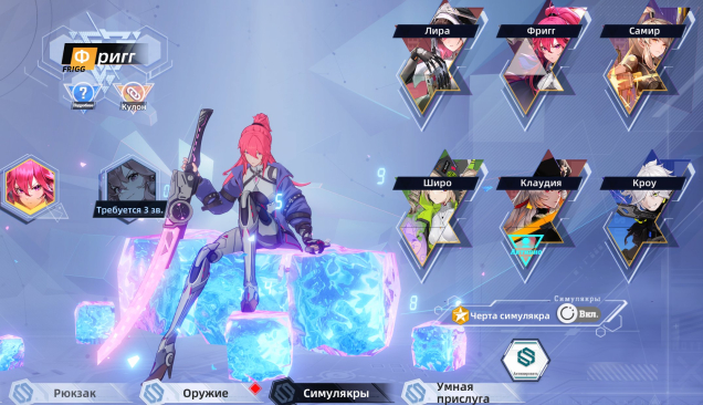 Подробное описание: Идеальный аккаунт для тех, кто хочет сразу заходить в контент без долгой прокачки. На главном слоте — Фригг с крутой визуалкой: розовые волосы, ледяной меч и эффектные кристаллы. Справа в ростере — сильный подбор симулякров: Лира, Фригг, Самир, Широ, Клаудия (активна), Кроу. Интерфейс аккуратно оформлен, есть доступ к вкладкам «Рюкзак», «Оружие», «Симулякры» — всё готово к передаче и дальнейшему развитию.