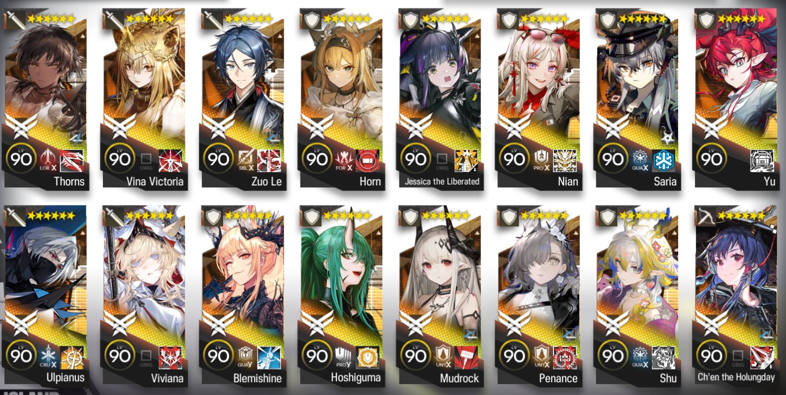 Global. 120 LvL, 97,4% всех операторов, все лимитные персонажи. 124 Originium и 63к Orundum.