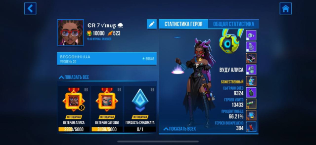 Все персонажи божественного ранга кроме 4 персонажей Твинкл, Квон, Гравиэль, Скретч. Хорошая прокачка снаряжения до бессмертного. Есть медаль синдиката за топ 1 в сезоне. Если хотите посмотреть подробнее аккаунт это можно сделать по Id на фото. Вся статистика аккаунта и всех персонажей в вашем распоряжений .